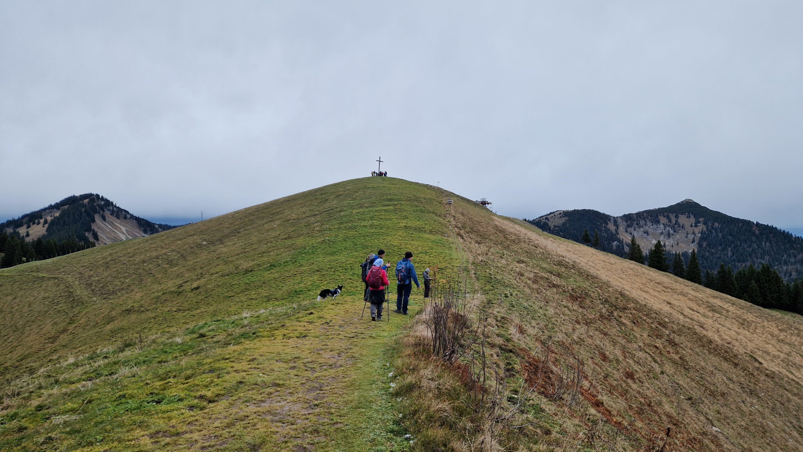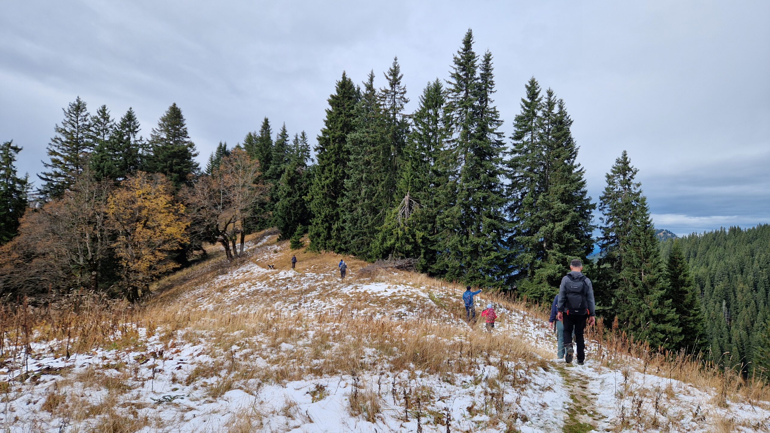 Auf dem bewaldeten Gipfel ohne Gipfelkreuz angekommen, ging es über den teils wurzligen Pfad des Stolzeneck-Grats in Richtung Roßkopf weiter. Der Weg führte steil hinunter in eine Senke und dann an der bewaldeten Westflanke des Rotkopfs vorbei durch dichten Bergwald. Nach kurzem Aufstig durch den Wald erreichten wir den breiten, grasigen Rücken des Roßkopfs (1580 m). Dort wurden wir mit einem herrlichen und weitreichenden Rundblick belohnt. Nur die Sonne fehlte, um den Blick auf die schneebedeckten Gipfel der Alpen perfekt zu machen und frischer Wind veranlasste uns zügig zum Weitergehen.