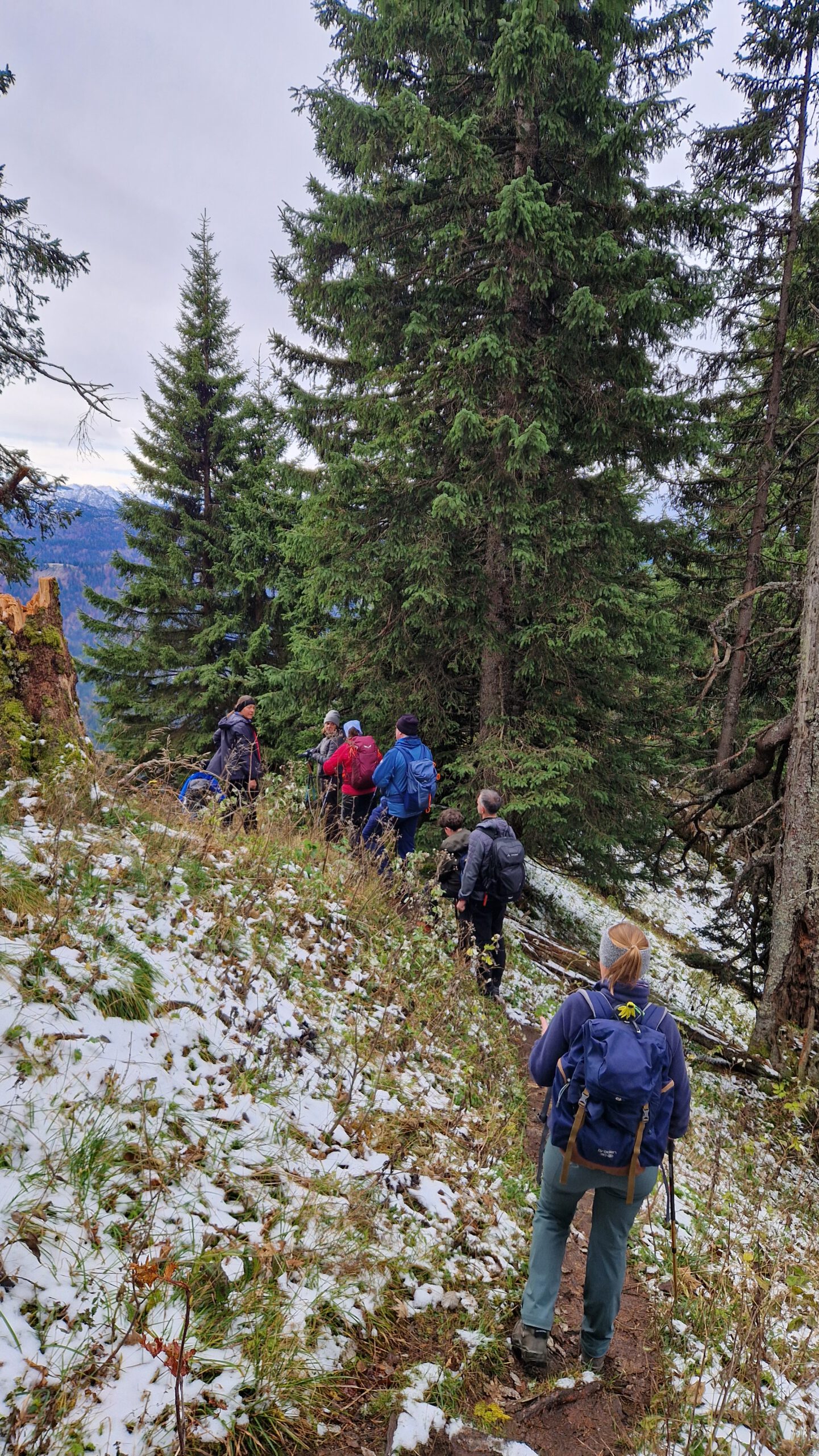 Der Abstieg gestaltete sich anspruchsvoll, denn der Pfad querte einen steilen, nassen Wiesenhang zum Grünsee. Alle Teilnehmer meisterten diese etwas mühsame Passage, nur die eine oder andere Wanderhose blieb nicht mehr ganz sauber. Über einen Querweg gelangten wir zurück zum Kessel zwischen Rotkopf und Stolzenberg und trafen dort wieder auf unseren Aufstiegsweg. Auf den letzten Metern des Abstiegs durch den Bergwald setzte leichter Regen ein, gerade noch vor dem stärkeren Regen erreichten wir die Albert-Link-Hütte (1053 m) zur wohlverdienten gemütlichen Einkehr. Ein echtes kulinarisches Highlight brachte uns wieder zu Kräften. Gut gestärkt machten wir uns auf den Weg zurück zum Auto und traten die Heimfahrt an.